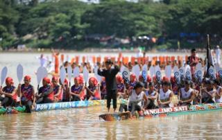 Tutup Lomba Dayung Tradisional, Bupati Afni Berhasil Seberangi Sungai Siak
