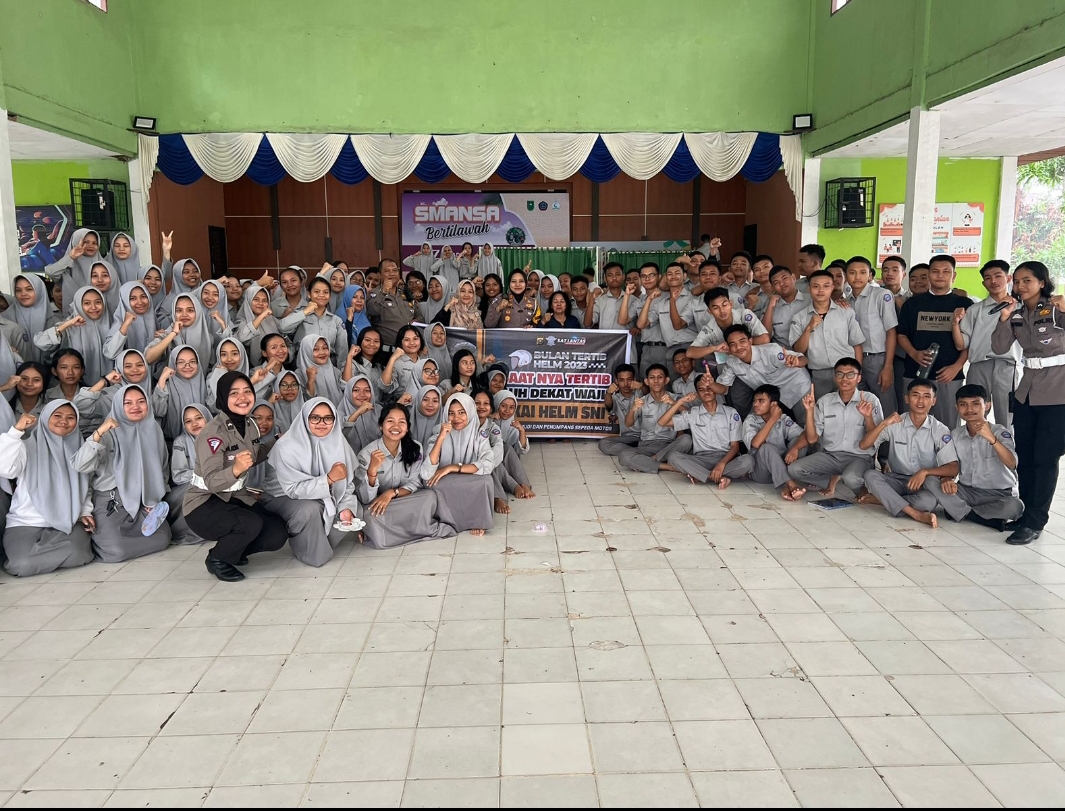 Kasat lantas Polres Pelalawan Gelar Bulan tertib Helm 2023 melalui Program Police Goes To School di SMAN 1 Pangkalan Kerinci.
