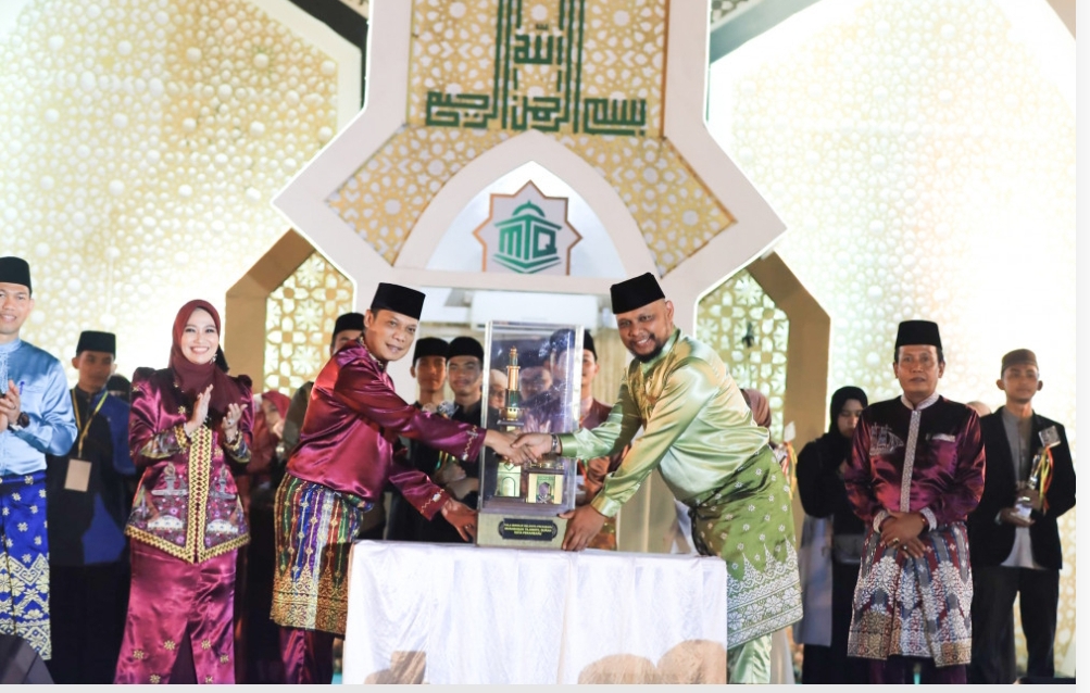 Pj Wali Kota Pekanbaru Muflihun SSTP MAP menyerahkan piala bergilir MTQ Ke-56 Tingkat Kota Pekanbaru Tahun 2024, Minggu, (03/03) malam
