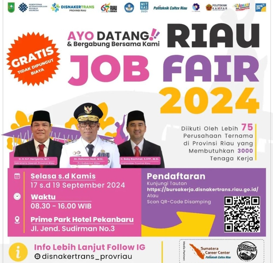 SCN | PEKANBARU - Riau Job Fair 2024 akan diselenggarakan pada 17 hingga 19 September mendatang. Terdapat 70 lebih perusahaan swasta hingga BUMN yang menawarkan total 3.000 lowongan pekerjaan pada kegiatan ini.