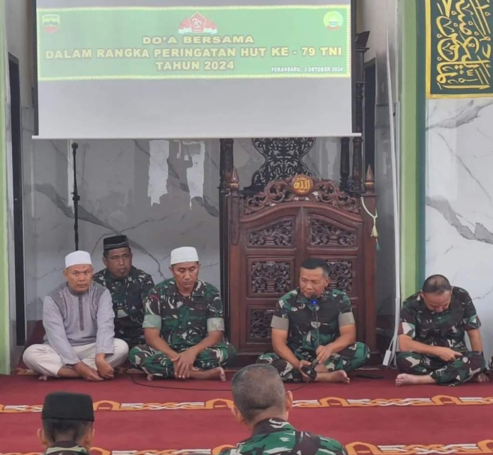 SCN | Pekanbaru - Dalam rangka memperingati Hari Ulang Tahun ke-79 Tentara Nasional Indonesia, Komando Resor Militer 031/Wira Bima menggelar acara doa bersama yang diadakan di Mesjid Al-Iman Makorem 031/WB Jalan Mayor Ali Rasyid ,Kota Pekanbaru.(03/10/24).