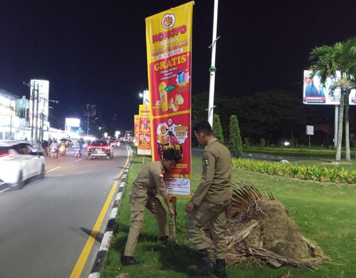Personil Satpol PP Pekanbaru Tertibkan Reklame yang Berdiri di Taman Simpang 3 Bandara