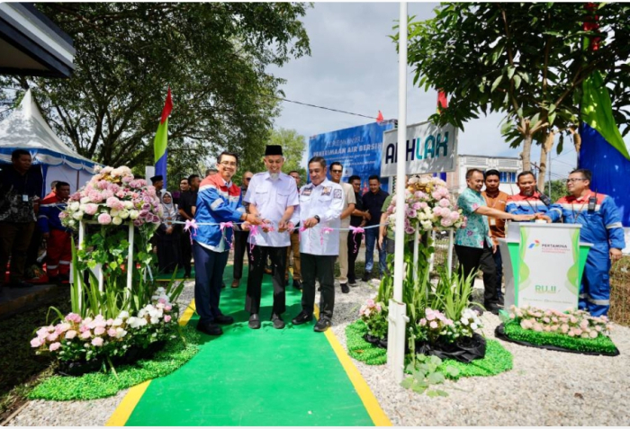 SCN | DUMAI - Perusahaan Daerah Air Minum (PDAM) Tirta Dumai Bersemai secara resmi memasok kebutuhan air bersih PT. Kilang Pertamina Internasional - Unit II Dumai. Pengaliran ini secara seremonial dilaksanakan di Pos Pengamanan Komplek Perumahan PT. KPI - RU II Dumai di Jalan MH Thamrin, Kamis (16/1/2025).