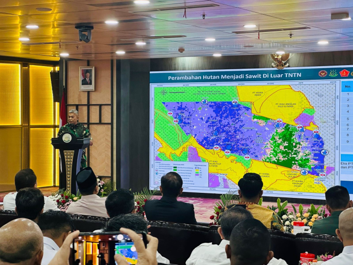 "Kami sampaikan dan tegaskan kepada masyarakat, untuk kawasan Hutan Taman Nasional Tesso Nilo, akan segera dilakukan percepatan dan pemulihan. Begitu juga dengan sawit yang ada didalamnya akan dimusnahkan dan ditanami kembali tanaman atau pohon asli hutan," tegas Komandan Satgas PKH Mayjend TNI Dodi Triwinarto.