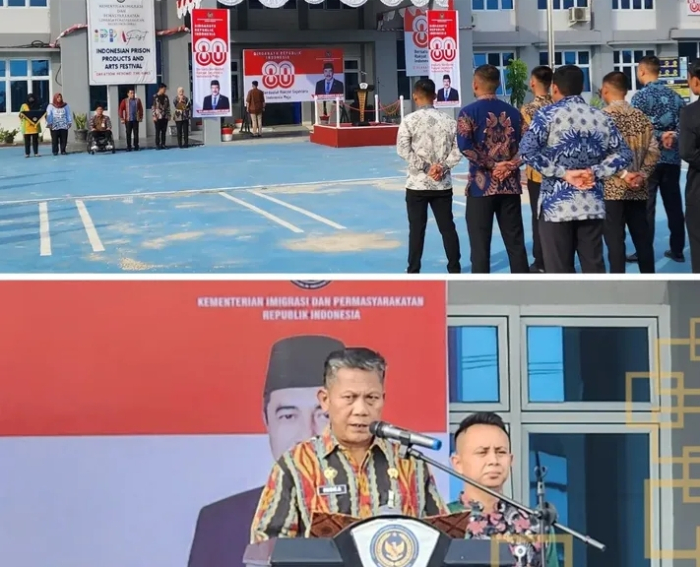 Dengan mengenakan pakaian Wastra Nusantara, Kalapas menyampaikan sambutan dari Menteri Koordinator Bidang Hukum, Hak Asasi Manusia, Imigrasi dan Pemasyarakatan, Yusril Ihza Mahendra.