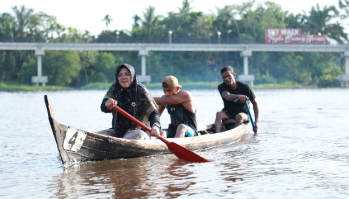 Dengan wajah penuh semangat, Bupati Afni yang didampingi 2 orang peserta lomba dayung tradisional, berhasil mendayung sampan menyeberangi sungai Siak.