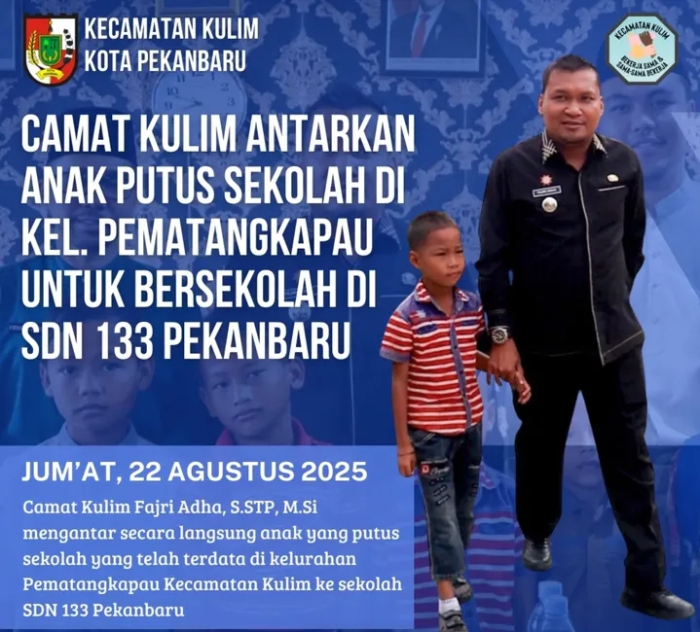 Camat Kulim Fajri Adha,S.STP.,M.Si bersama Plt. Lurah Pematangkapau dan kader posyandu Pematangkapau, melakukan pengantaran secara langsung ke sekolah sdn 133 Pekanbaru terhadap anak yang putus sekolah yang telah terdata di kelurahan pematangkapau Kecamatan Kulim, pendataan ini dilakukan oleh seluruh kader posyandu yg ada di Kecamatan Kulim.