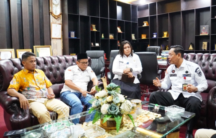 Audiensi dipimpin Ketua KPU Riau Rusidi Rusdan bersama jajaran komisioner, diterima langsung oleh Kepala Kesbangpol Riau Jenri Salmon Ginting.