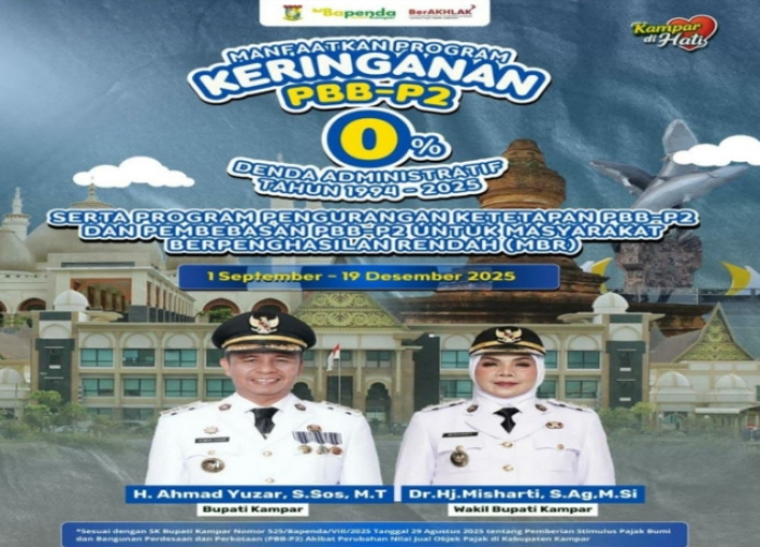 SCN | KAMPAR – Pemerintah Kabupaten Kampar melalui Badan Pendapatan Daerah (Bapenda) meluncurkan program keringanan Pajak Bumi dan Bangunan Perdesaan dan Perkotaan (PBB-P2) tahun 2025. Program ini menghadirkan kebijakan penghapusan denda administratif 0% untuk tahun 1994–2025 serta pengurangan ketetapan dan pembebasan PBB-P2 khusus bagi masyarakat berpenghasilan rendah (MBR).