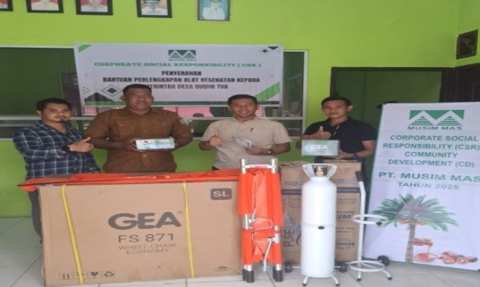 SCN | PELALAWAN -PT Musim Mas melalui program Corporate Social Responsibility (CSR) memberikan bantuan perlengkapan alat kesehatan di Desa Dusun Tua, Kecamatan Pangkalan Lesung, Kab. Pelalawan Penyaluran bantuan ini merupakan bagian program perusahaan dalam mendukung kesehatan nasional selaras dengan program Pemerintah Kabupaten Pelalawan.