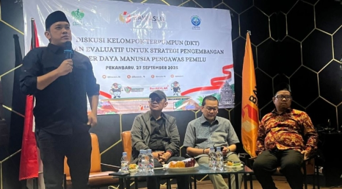 SCN | PEKANBARU – Pimpinan Bawaslu Provinsi Riau mengikuti kegiatan Diskusi Terpumpun Pembinaan Evaluatif untuk strategi pengembangan Sumber Daya Manusia (SDM) pengawas Pemilu, di Pekanbaru, Sabtu (27/9/2025).