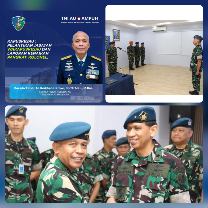 SCN | Jakarta, – Dalam sebuah upacara yang berlangsung khidmat, Kepala Pusat Kesehatan TNI Angkatan Udara (Kapuskesau) Marsekal Muda TNI M. Roikhan Harowi, Sp.THT-KL., M.Kes, secara resmi melantik Marsekal Pertama TNI dr. Adhantoro Rahadyan, Sp.JP., F.I.H.A (K) sebagai Wakapuskesau. Acara ini digelar pada hari Senin, 20 Oktober 2025 di Markas Pusat Kesehatan TNI AU.