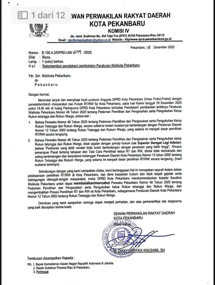 SCN | PEKANBARU - Menindaklanjuti dan menyikapi hasil audensi anggota DPRD kota Pekanbaru (Lintas Fraksi-fraksi) dengan perwakilan tokoh masyarakat, dan Forum RT/RW se-Kota Pekanbaru pada Kamis (18/12/2025) lalu, terhadap Peraturan Wali Kota Pekanbaru Nomor 48 Tahun 2025 tentang Pedoman Pemilihan, Pengesahan, dan Pengukuhan Ketua Rukun Tetangga (RT) dan Rukun Warga (RW) yang dinilai cacat secara substansi dan berpotensi merusak tatanan demokrasi di tingkat lingkungan masyarakat.